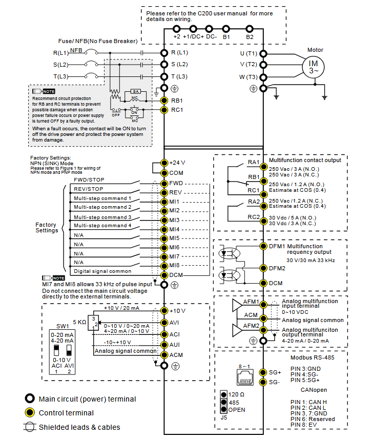 NOTE: The short circuit protection is provided for AC motor drive protection, not for protection of the user.