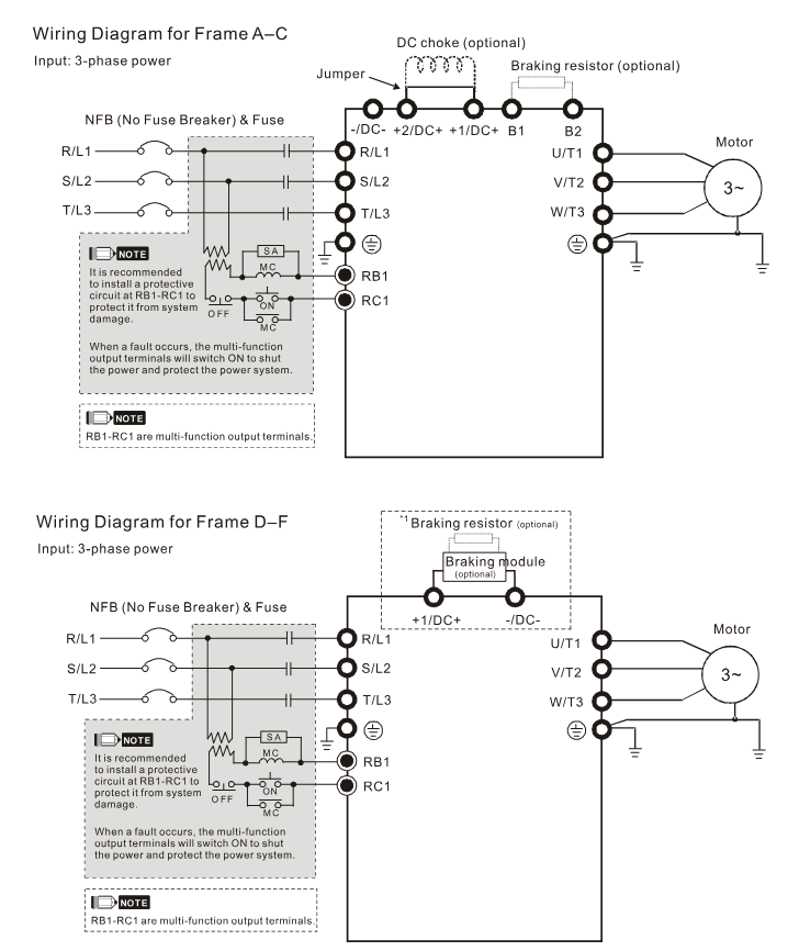 | bF Brake transistor fault | Cause: The brake transistor of the motor drive is abnormal. (for the models with built-in brake transistor). Soultion: 1. Hardware fault – 1. Press “RESET” key to go back to the default. If bF still occurs, then there is an hardware issue in drive need to repair or replace drive. – 2. Power off the motor drive since the internal circuit is abnormal. Use a meter to check if it is short-circuit between B2 to DC-. If short-circuit occurs, then there is an hardware issue in drive need to repair or replace drive. 2. Malfunction caused by interference – Verify wiring/grounding of the main circuit to prevent interference. 3. Using the incorrect brake resistor – Check if the resistance value of the brake resistor matches to the drive. |