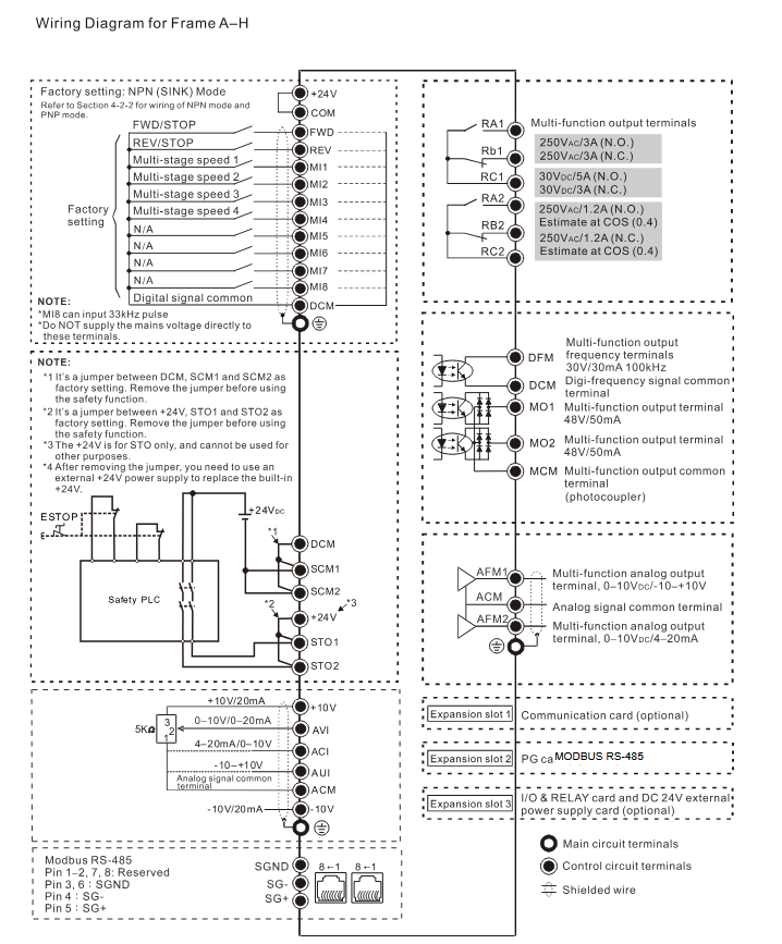 | AFE PID loss ACI | Meaning: PID feedback loss (analog feedback signal is only valid when the PID function is enabled). – When the analog input < 4 mA (only detects 4–20 mA analog input. Fault treatment parameter Pr.08-09 – 0: Warn and continue operation – 1: Fault and ramp to stop – 2: Fault and coast to stop – 3: Warn and operate at last frequency Cause & Solution: 1. PID feedback cable is loose or cut off – Tighten the terminal. – Replace the cable with a new one. 2. Feedback device failure – Replace the device with a new one. 3. Hardware failure – Check all the wiring. |