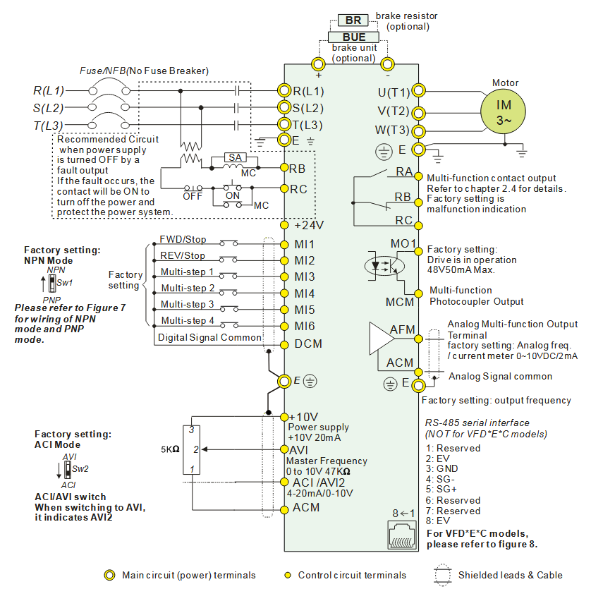 1. When multi-function input terminals (MI3-MI9) are set to external fault, the AC motor drive stops output U, V and W.