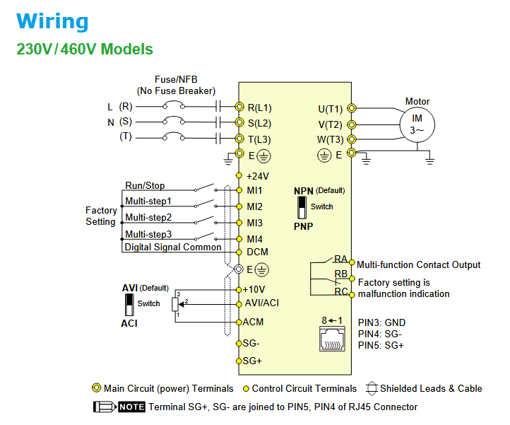 | FbE PID feedback signal error | Cause: PID feedback signal error. Soultion: 1. Check the parameter settings (Pr.10.01) and AVI/ACI wiring. 2. Check for possible fault between the system response time and the PID feedback signal detection time (Pr.10.08) |