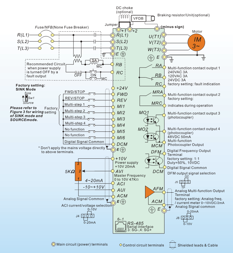 1. When the external input terminal (B.B) is active, the AC motor drive output will be turned off.